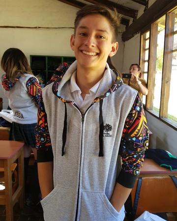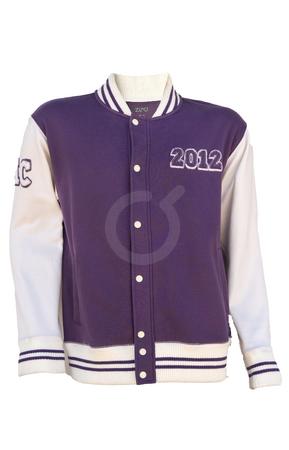 Chompa colegial. Fleece perchado. Cuello, puños y bajo tejidos. Broches o cierre.