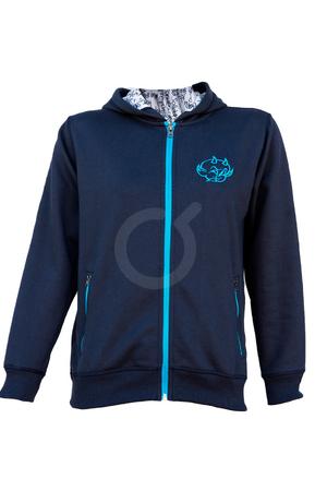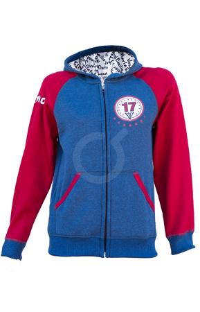 Chompa fleece. Capucha forrada de tela wafle y cordón redondo. Bolsillos canguro. Puño y bajo de rib. Cierre premium oculto. Estampado de alto relieve. Apliques. Nombre bordado.